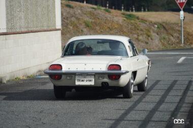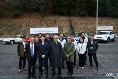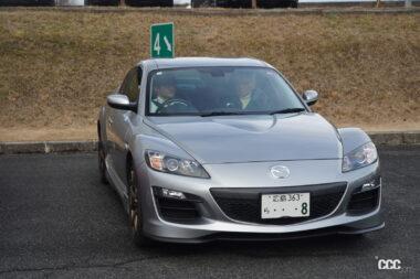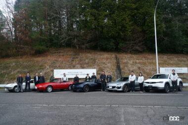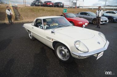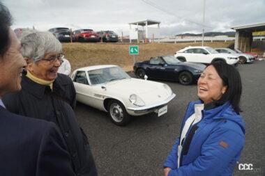 初日は三次自動車試験場(テストコース)にて、テストドライバーの運転による歴代マツダ車の「再」試乗。試乗車はコスモスポーツから最新のロータリーEVのMX-30まで勢揃い。